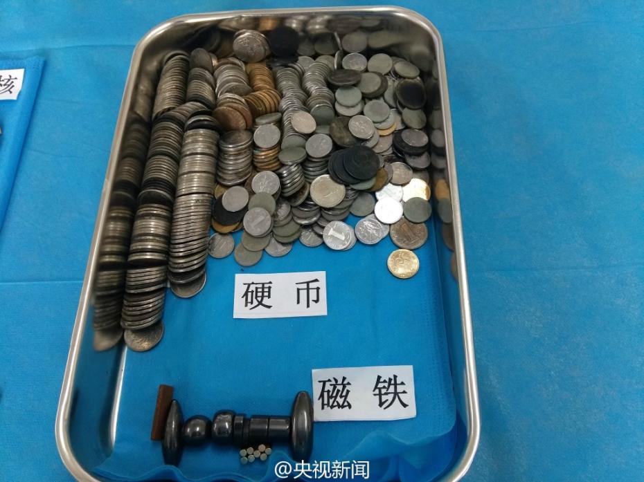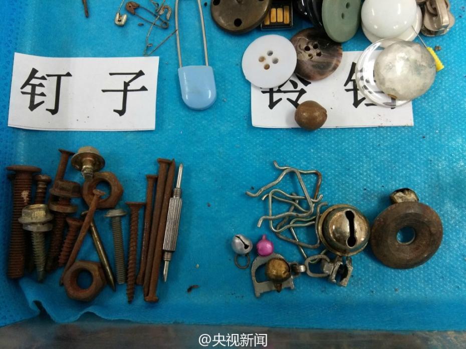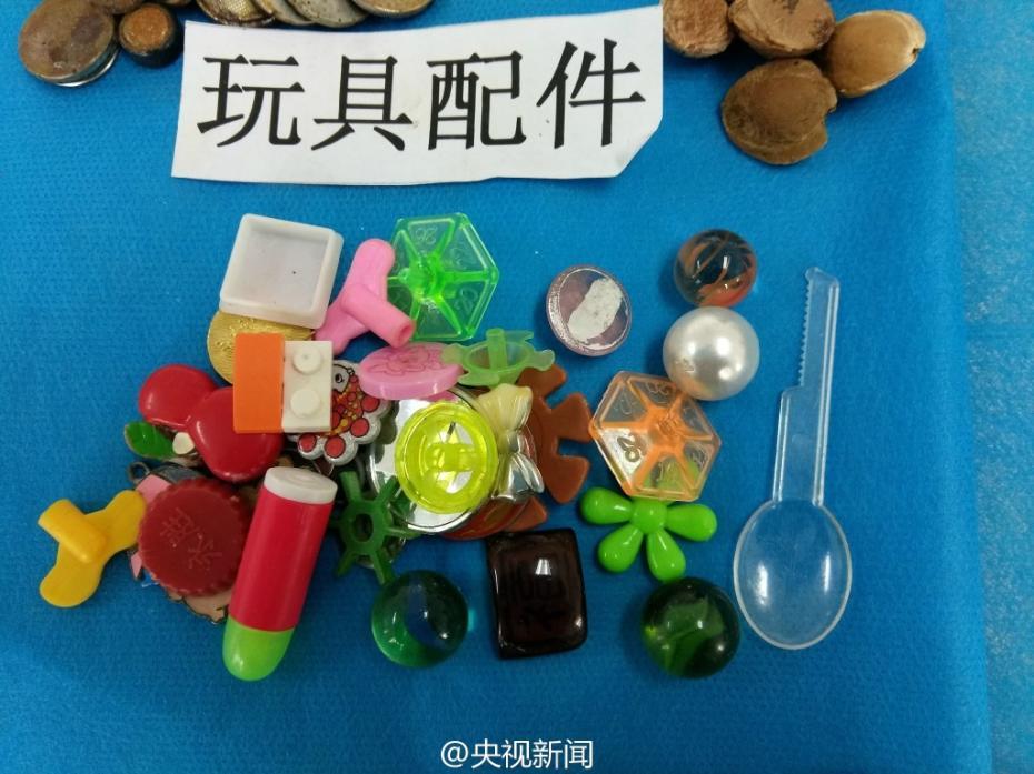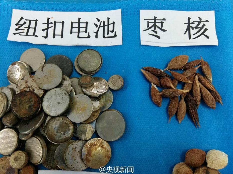 这是西安市儿童医院呼吸科近三年多取出的部分异物,纽扣电池、枣核、玩具配件、钉子、塑料棒、缝衣针、玻璃弹珠,最多的就是硬币…医生提醒,家长要经常叮嘱教育宝宝不随便将东西放入口内,经常检查玩具是否有零部件松散,一定看好孩子。央视记者杨永青 图片来源:央视新闻官方微博