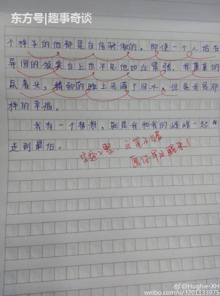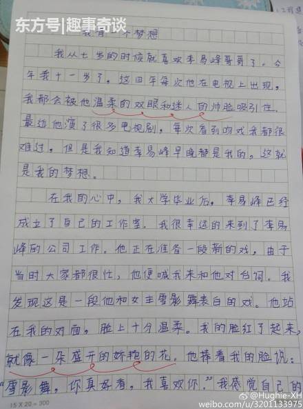 小学生作文告白李易峰,老师评语亮了 近日,有老师晒出一份学生的作文,作文题为《我有一个梦想》,并配文:现在的小学生真是,一天天脑子不知道想的啥。李易峰知道你这么屌吗?文中学生表达了自己对李易峰的爱慕之情,并在最后点明主题:“我有一个梦想,就是我和我的峰峰一起走到最后。”对此,老师的评语是:字迹工整,文笔不错,愿你早日醒来! 上一篇 惊险!安徽一男子一打开车门火球扑面而来,险 上一篇 男子得知“红颜知己”遭家暴 怒砸其丈夫2辆车