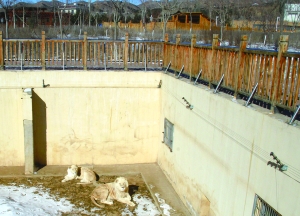 不远处的白狮子的家,则是一个坑式的场地。两只白狮子在场地中央安闲地踱步,似乎并不在意寥落的游客。在大青山野生动物园管理处副主任郭胜的带领下,记者走进了白狮子的饲养区。同样是两道铁门之后,饲养员苗利明正在此值班。透过值班室的窗户,不时能看到白狮子走到窗户下张望。