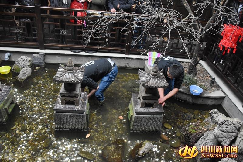 春节期间,宽巷子37号的一个景观池因为游客们的投币祈愿,成为了新年成都的第一个“网红”,被网友们称为“网红池”。管理方最初措手不及,为如何处理池内的祈愿钱币犯了难,网友们在“网红池”管理方“记忆四川”的微信公众号上献计献策。最后,管理方决定响应多数网友的建议,将池内的钱币打捞起来,捐献给重病中的山东籍抗震救灾志愿者史业宽。10日,“网红池”的管理者就将池中的5200多枚硬币悉数打捞上岸,并将这饱含着游客美好祝愿的钱币,送到了史业宽家属的手中。(记者 周子铭 雷兹 漆奇 实习生 冯灵 摄影报道)