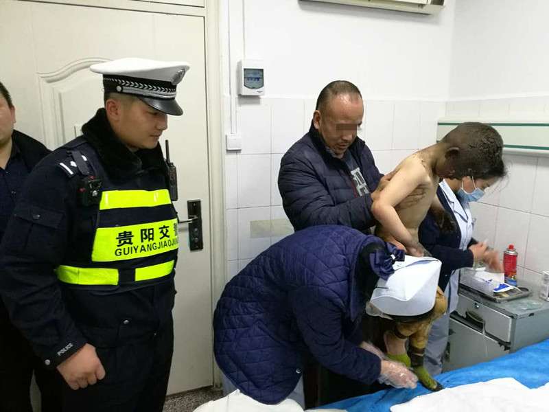 据民警介绍,2 月 10 日 14 时 15 分左右,一辆红色轿车从黔灵西路方向往喷水池路口行驶,车上突然在路口停下,一名乘客慌忙向交警求助:" 车上有烧伤的娃娃。"