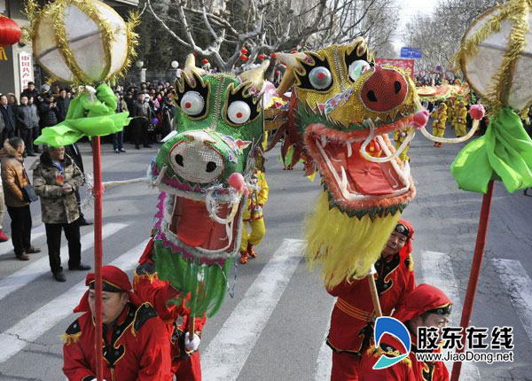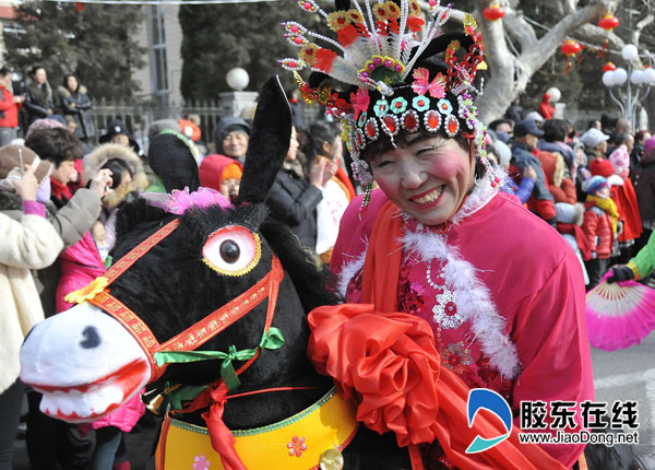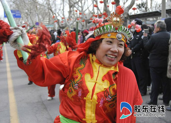 胶东在线2月10日讯(记者 侯嘉伟 通讯员 赵逢晶 孙文潭)2月10日上午9点,福山区元宵节“秧歌进城”大型民俗表演活动在县府街拉开帷幕,8个镇街园的表演方阵、33支表演队伍、3000多名文艺爱好者,表演了抬阁、雷鼓、高跷、大头娃娃、腰鼓、舞龙、舞狮、划旱船、赶毛驴、彩扇、丑婆、“新西游记”等众多民俗节目,为市民献上了一道妙趣横生、精彩纷呈的“过年大餐”,上万名观众在现场大饱眼福。