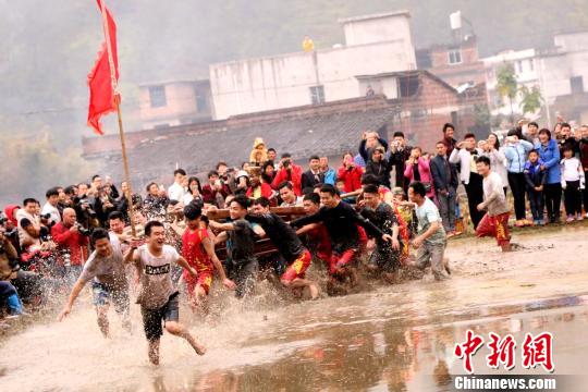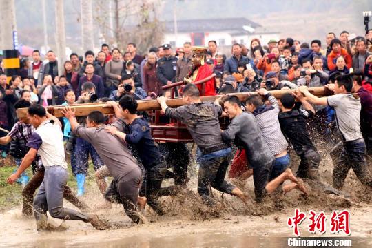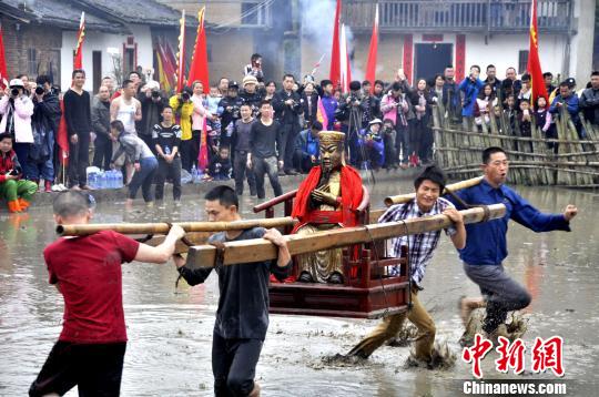 村民们抬着上百斤重的菩萨在泥田里奔跑。黄建梅 摄