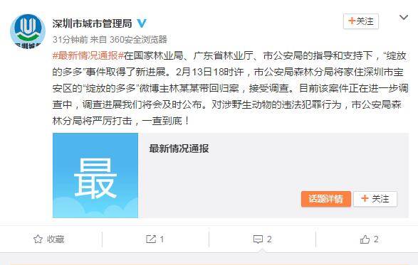 深圳“穿山甲公主”被公安局带回归案 @深圳市城市管理局:在国家林业局、广东省林业厅、市公安局的指导和支持下,“绽放的多多”事件取得了新进展。2月13日18时许,市公安局森林分局将家住深圳市宝安区的“绽放的多多”微博主林某某带回归案,接受调查。目前该案件正在进一步调查中,调查进展我们将会及时公布。对涉野生动物的违法犯罪行为,市公安局森林分局将严厉打击,一查到底! 上一篇 农村遍地都是的“蓝星星”,加白酒喝能补肾强 上一篇 “变废为宝”煅烧高岭土