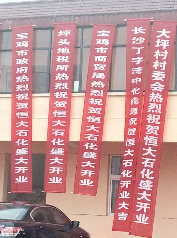 “宝鸡一加油站开业,众多政府部门送来祝贺条幅。”2月6日晚间,有网友爆料称,陕西宝鸡陈仓区坪头镇一家名为“恒大石化”的加油站刚开业不久,墙上挂的条幅却十分惹眼,其中不乏来自宝鸡市政府、坪头镇政府、坪头地税所、坪头派出所等多个政府机关发来的祝贺。
