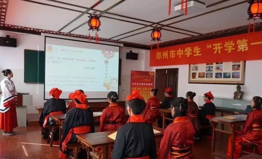3.郑州市第三十九中学开学第一天,学生们身着古典汉服,在古色古香的教室中诵读《论语》,共同上了一堂传统文化教育课。
