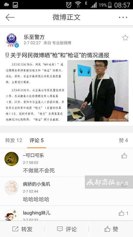 2月7日凌晨2时27分,乐至县公安局新浪官方微博“乐至警方”发布了关于网民晒“枪”和“枪证”的情况通报。